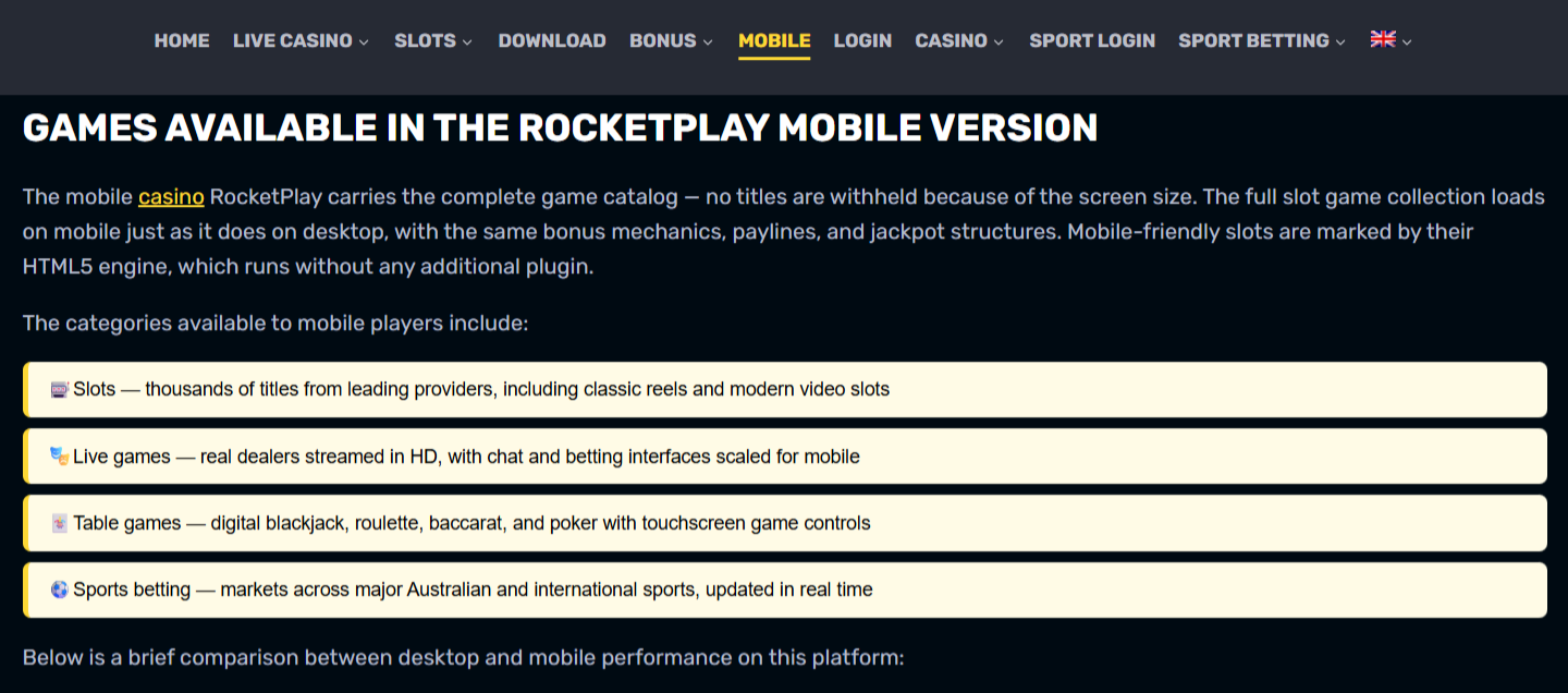 The RocketPlay mobile browser model is attractive because it combines speed, flexibility, and full access without adding technical steps. The page emphasizes complete game availability, browser based entry, responsive layout, and automatic updates through the web version, which makes the format especially practical for players who want quick sessions on phones and tablets without depending on a standalone app. For everyday use, that balance of simplicity and functionality is the main reason the platform feels easy to return to. ✅